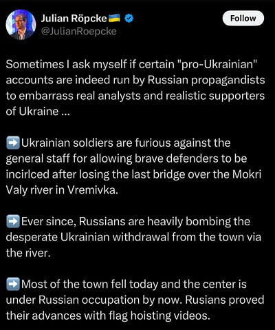Comme indiqué précédemment, l’avantage de la Russie ne fait qu’augmenter tandis que celui de l’Ukraine diminue d’heure en heure. Il n’y a littéralement aucune raison pour que la Russie veuille négocier maintenant qu’elle s’approche du seuil de la victoire totale.