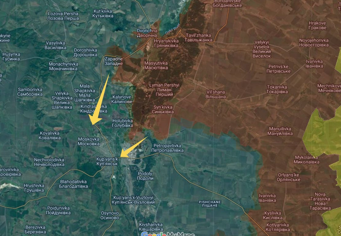 Il y a un point qui mérite d’être mentionné et qui n’a pas été commenté par beaucoup : la Russie a sournoisement étendu une tête de pont assez intéressante juste au nord de Koupiansk. Cela a commencé comme une opération de sondage exploratoire il y a quelque temps, mais cela s’est maintenant transformé en une véritable tête de pont à l’ouest de la rivière Oskil