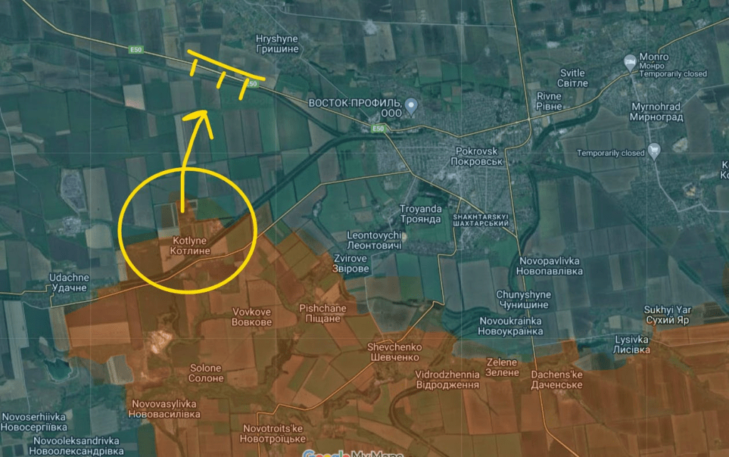 Vous pouvez voir ci-dessous que la route principale vers Udachne a été capturée, mais maintenant un nouveau saillant s’étendant vers le nord est apparu vers la critique E50 et de même la critique Hryshyne, une ville que j’avais mentionnée dans un rapport précédent qui serait la clé pour encercler Pokrovsk