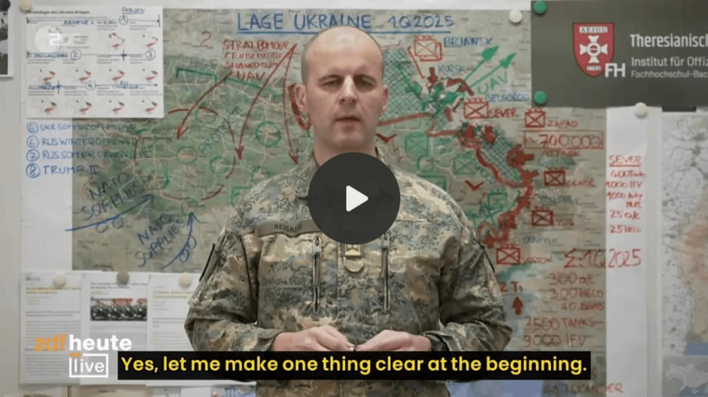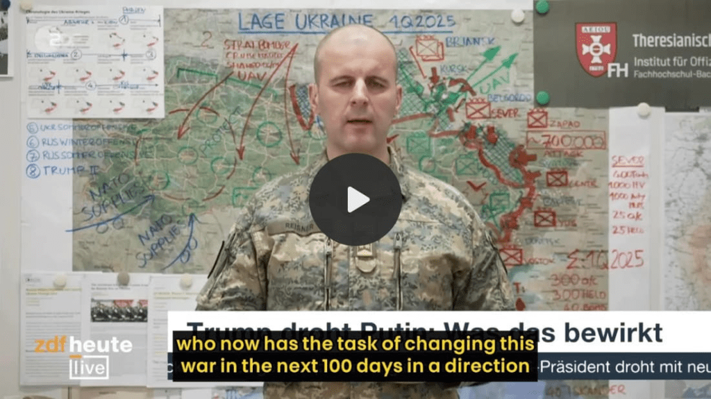 Il suffit d’écouter la dernière interview du colonel autrichien Markus Reisner sur la chaîne ZDF, où il déclare sans équivoque que l’Ukraine pourrait ne même pas survivre les trois mois qu’il faudrait pour parvenir aux « 100 jours de négociations »