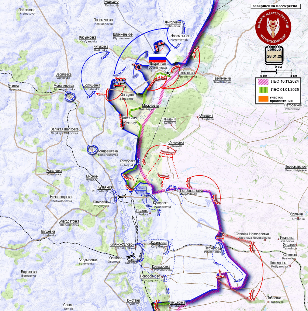 ЛБС 02.01.2025=Ligne de contact de combat 2 janvier 2025. Продвижение, Зона активности=Avance/Zone d’activité. (Les forces opposées se répartissent en différentes couches, comme un gâteau en couches, avec des couches de contrôle alternées.)