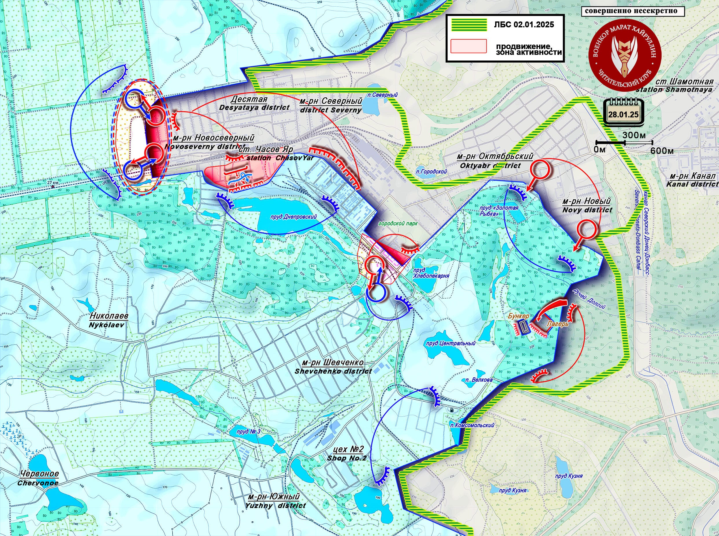 s combats continuent à Chasov Yar, au nord-ouest de la ville. En même temps, nos troupes se déplacent toujours plus au sud, vers la région de l’étang de Dniepr, en renforçant efficacement leurs forces à l’arrière des unités des forces armées ukrainiennes qui se sont retranchées près des immeubles. Dans les immeubles eux-mêmes, nos troupes avancent progressivement dans leurs quartiers sud et ont commencé des opérations de combat actives dans les immeubles à l’ouest de l’usine de réfractaires. Des rapports commencent à apparaître selon lesquels l’ennemi a commencé à quitter les quartiers par petits groupes, laissant les forces principales sur place pour le moment pour retenir nos troupes au moins pendant un certain temps. Même l’ennemi ne voit aucune possibilité de conserver la ville.