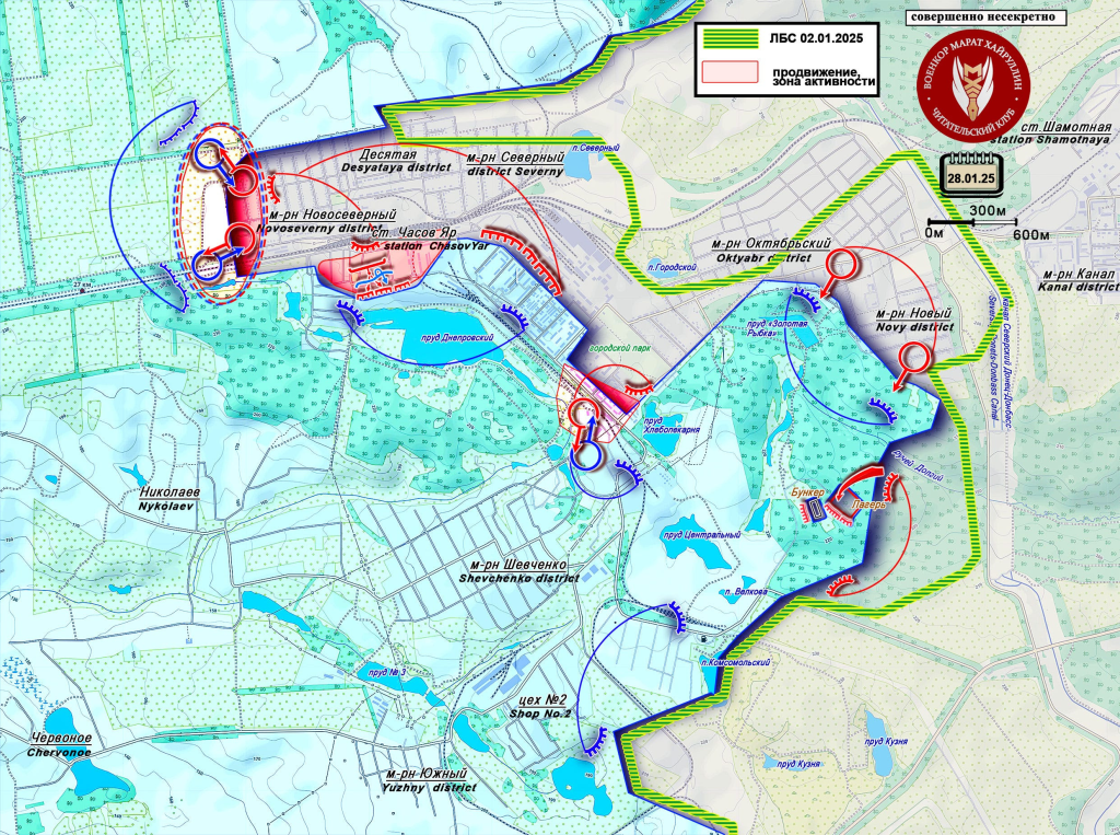 La zone forestière au sud-ouest du microdistrict de Novy est également progressivement débarrassée de l’ennemi. Après avoir pris pied sur le territoire d’un camp d’enfants, nos groupes d’assaut ont avancé plus à l’ouest et ont pris le contrôle du soi-disant « bunker ». Il s’agit d’une structure fortifiée avec des héliports situés à proximité, où se trouve le poste de commandement des forces armées ukrainiennes depuis l’ATO (opération antiterroriste). Les combats se sont également intensifiés dans le sud de la zone. Nos unités avancent en direction du village de Stupochki
