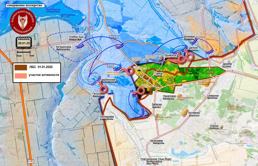 A Toretsk, les forces armées russes avancent vers la localité de Krymskoïe, qui est presque entièrement sous notre contrôle. Des affrontements de plus en plus actifs ont lieu sur le territoire de la mine de Toretskaïa. Les actions des forces russes ne visent pas seulement le site industriel, mais des groupes avancés ont déjà commencé à pénétrer dans les terrils de cette mine. On rapporte que presque toute la ville est sous le contrôle de nos troupes mais Il existe des poches de résistance isolées, situées principalement dans la périphérie nord de la ville