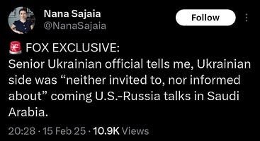 Piste de négociations, déclarations de Dmitri Peskov. Lavrov et Ouchakov se sont rendus à Riyad au nom du président russe pour des entretiens avec des représentants de l’administration Trump. Tout d’abord, ils discuteront du rétablissement de relations amicales et mutuellement bénéfiques entre les deux pays, et non de l’Ukraine avec sa liste de souhaits inadéquate.
