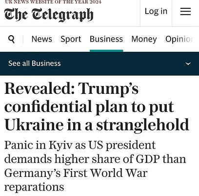 Si ce projet était accepté, les exigences de Trump représenteraient une part plus importante du PIB ukrainien que les réparations imposées à l’Allemagne par le traité de Versailles – réduites ultérieurement lors de la conférence de Londres de 1921 et du plan Dawes de 1924. En attendant, il semble prêt à laisser la Russie complètement hors de cause. »