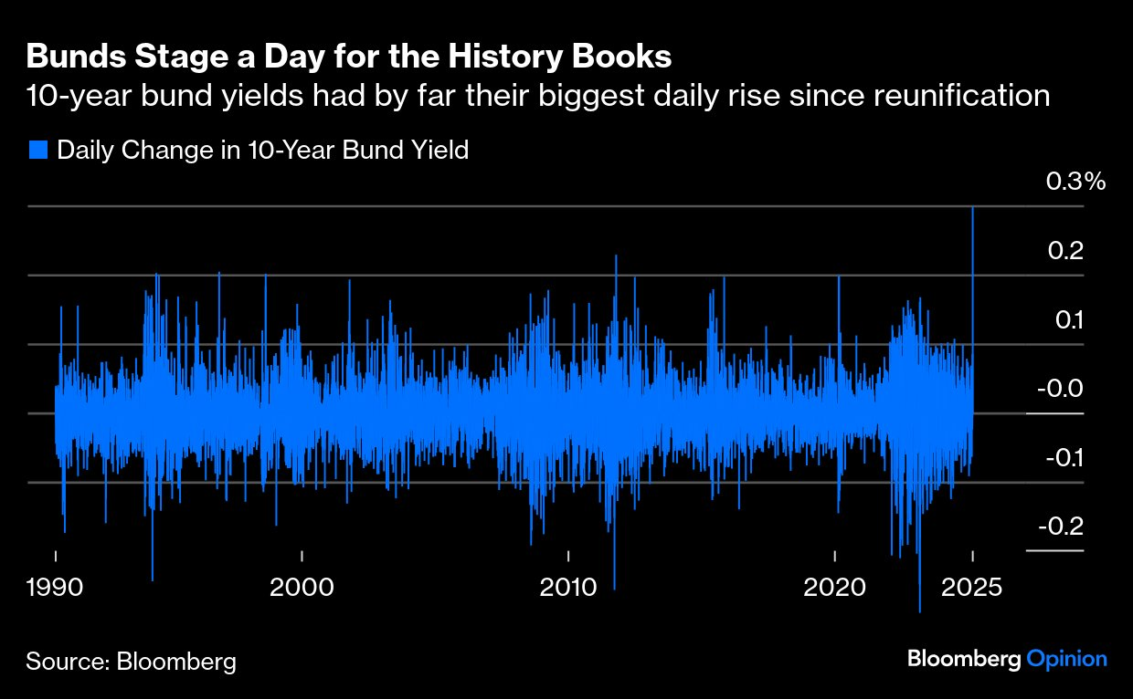 « ‘Les événements à la Conférence de Munich sur la sécurité et dans le Bureau ovale ont clairement eu un impact énorme sur la pensée du leader de la CDU, Friedrich Merz’, Greg Fuzesi, économiste chez JPMorgan… ‘L’Allemagne se dirige non seulement vers un revirement massif de sa politique budgétaire, mais aussi vers une réponse très forte aux nouveaux défis de défense et de sécurité.’ »