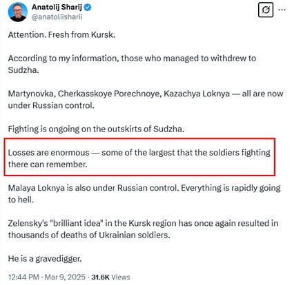 Comme déclenché par la série d’échecs diplomatiques récents, le front ukrainien de Koursk a initié un effondrement catastrophique. Les pertes sont énormes.