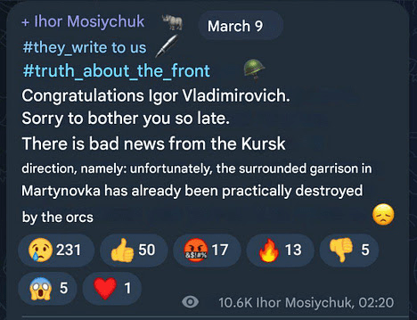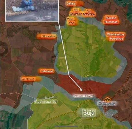 D’autres sources affirment que la région de Martinovka, juste au nord de Soudja, était complètement reliée à Lebedevka, créant un chaudron pour tout ce qui se trouvait au nord de là