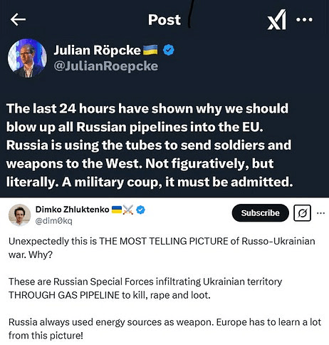 Nous parlons des conduites souterraines du gazoduc Ourengoï-Pomary-Ouzhgorod , par lesquelles la Fédération de Russie a fourni du gaz à l’Europe via le territoire de l’Ukraine jusqu’au 1er janvier 2025. Le diamètre d’un tuyau est de 1,4 mètre.