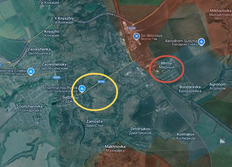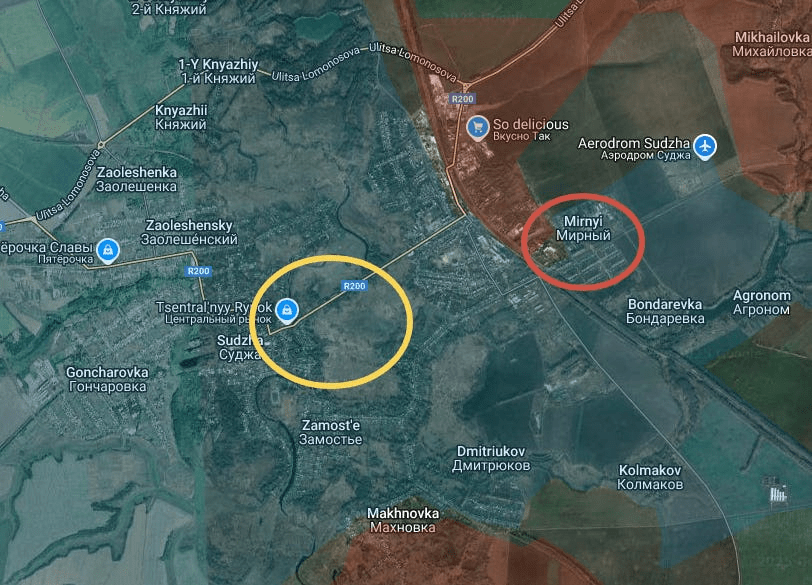 D’autres rapports indiquent que Mirnyi et ses environs (cercle rouge) sont en cours de nettoyage ou sont déjà entièrement capturés, tandis que les forces russes s’infiltrent déjà dans les parties orientales de Soudja (cercle jaune)