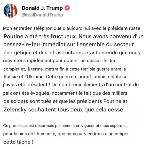 Les dirigeants ont non seulement réaffirmé leur engagement en faveur d’une résolution pacifique du conflit ukrainien, mais ont également convenu de mesures concrètes : un moratoire de 30 jours sur les attaques contre les infrastructures énergétiques, un échange de prisonniers et le transfert des blessés. Poutine a déclaré qu’il était prêt à travailler avec ses partenaires américains pour explorer en profondeur les moyens possibles de résoudre la situation, qui devraient être complets, durables et à long terme.