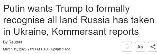 En échange de cette reconnaissance, et si elle se concrétise « dans un avenir proche », Kommersant a déclaré que Poutine s’engagerait à ne pas revendiquer la ville portuaire ukrainienne d’Odessa ni aucun autre territoire ukrainien.