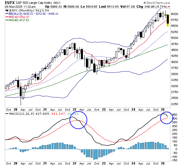 Le graphique mensuel est horrible . Nous sommes sur le point d’enregistrer un signal de vente de long terme Historiquement ce type de signal précède des baisses boursières de 20 à 40 %.