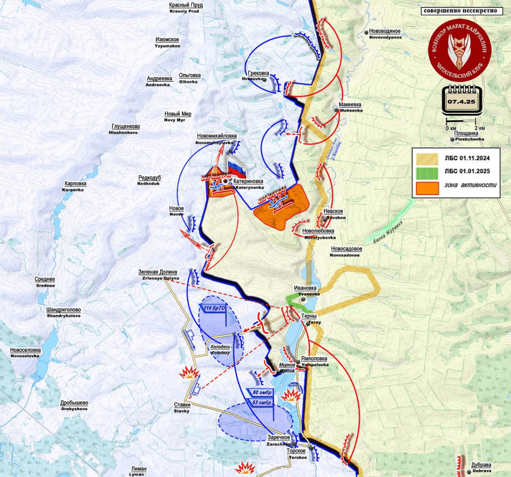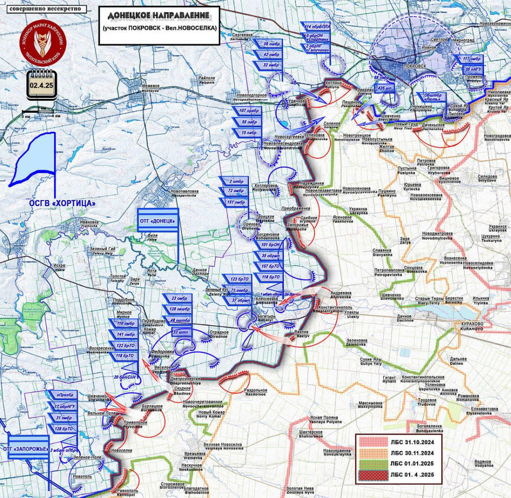 ЛБС 31.10.2024=Contact de la ligne de combat le 31 octobre 2024. ЛБС 30.11.2024=Contact de la ligne de combat le 30 novembre 2024. ЛБС 01.01.2025=Contact de la ligne de combat le 1er janvier 2025. ЛБС 01.4.2025=Contact de la ligne de combat le 1er avril 2025.
