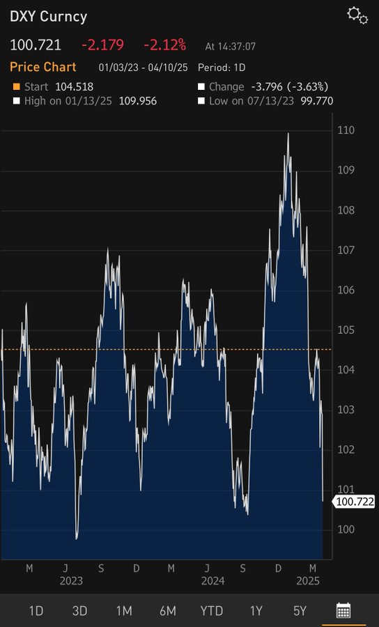 L’or à un niveau record et l’indice du dollar DXY à son plus bas niveau en deux ans en disent plus que TOUT sur la période actuelle d’incertitude et de volatilité. A mi journée le DXY est passé sous les 100.