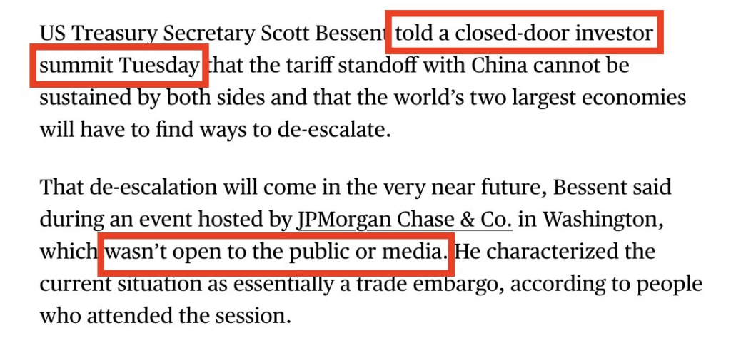 Bessent a effectivement déclaré à un groupe fermé d’investisseurs de Wall Street que la désescalade avec la Chine allait avoir lieu AVANT que le public ne le sache.