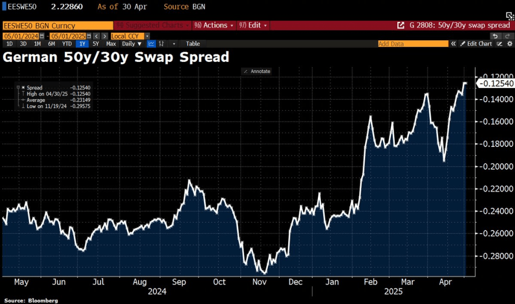 L’écart entre les obligations allemandes à 50 et 30 ans s’est accentué (est devenu moins inversé), atteignant un nouveau sommet pluriannuel.