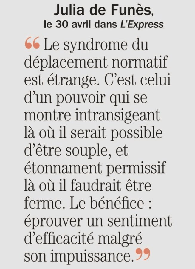 Une façon de mettre en mots ce que nous observons tous; une gestion spectacle, lâche, inadaptée, névrotique car fondée sur le déplacement. Une gestion qui préfère emmerder les honnêtes gens plutôt que courir le risque d’entrer en conflit avec les malfaisants.