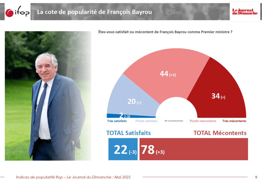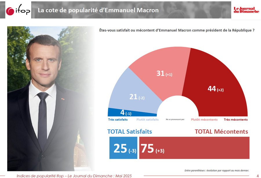 Emmanuel Macron enregistre une baisse de 3 points avec 25 % de satisfaits ce mois-ci. L’émission spéciale du 13 mai dernier semble avoir « eu un effet catalyseur de toutes les critiques qui étaient en sommeil jusqu’ici » selon Frédéric Dabi. Macron perd du terrain auprès des retraités (29 %, −5 points), des cadres (30 %, -6 points) et chez ses propres électeurs de 2022 (64 %, −9 points).