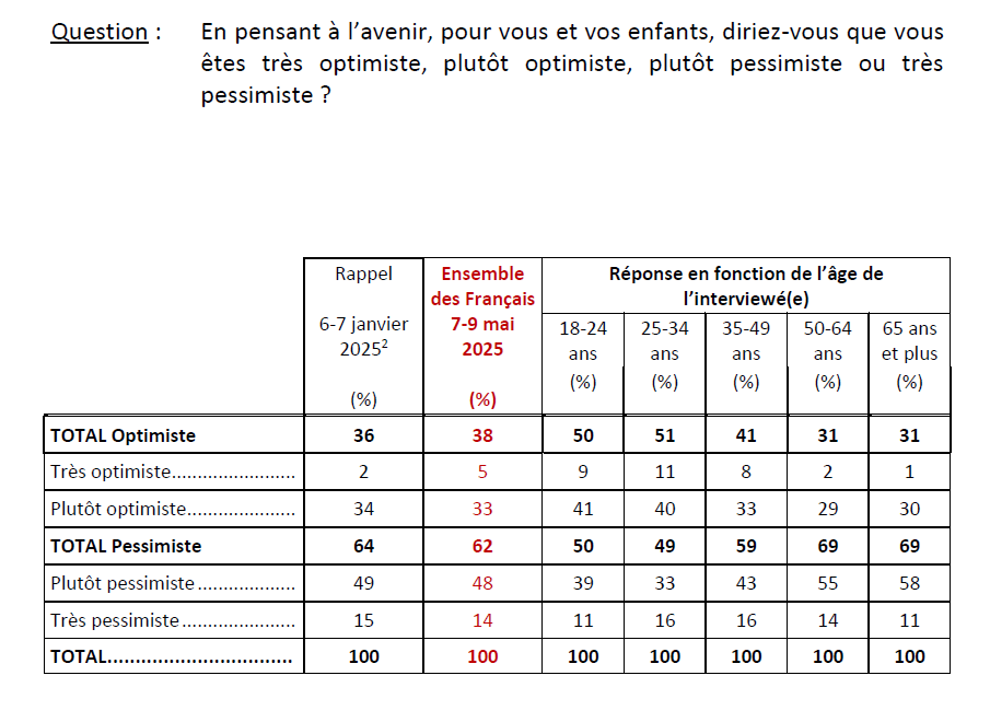 Nous observons une hausse du degré d’optimisme des Français (38% aujourd’hui contre 36% en janvier). Nous constatons également des écarts générationnels : 51% des moins de 35 ans se déclarent optimises face à l’avenir, contre 31% parmi les 65 ans et plus