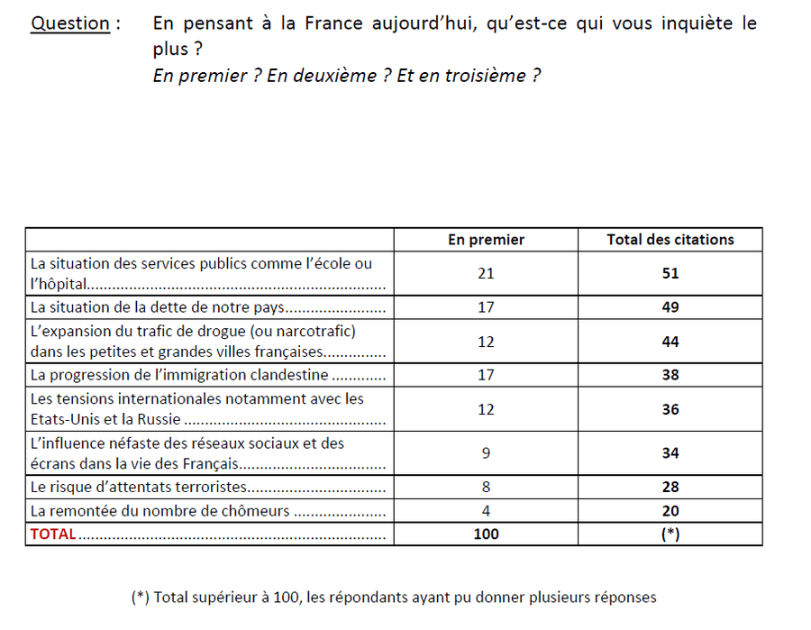 Les Français identifient clairement des motifs d’inquiétude : la situation des services publics comme l’école ou l’hôpital (51% de citations) arrive en premier, suivie de la situation de la dette du pays (49%) et – sujet très présent dans le discours des Français – l’expansion du trafic de drogue dans les petites et grandes villes françaises (44%)