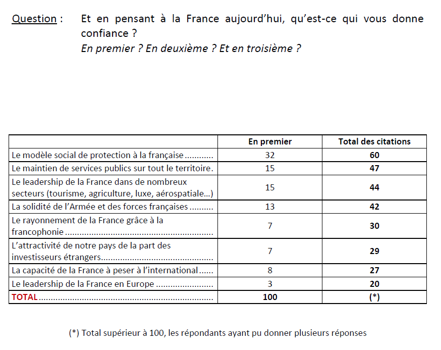 Pour autant, des facteurs de confiance émergent auprès des Français, notamment avec intensité le modèle social à la française (60% de citations). Notons que le leadership de la France dans de nombreux secteurs (tourisme, agriculture, luxe, aérospatiale…) est mentionné par une part significative de Français (44%)