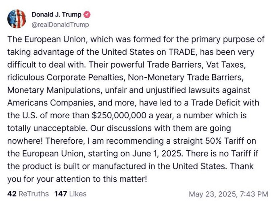 ‘Union européenne, créée principalement pour exploiter les États-Unis en matière de commerce, a été très difficile à gérer. Ses puissantes barrières commerciales, sa TVA, ses sanctions ridicules contre les entreprises, ses barrières commerciales non monétaires, ses manipulations monétaires, ses poursuites judiciaires injustes et injustifiées contre des entreprises américaines, entre autres, ont entraîné un déficit commercial avec les États-Unis de plus de 250 000 000 de dollars par an, un chiffre totalement inacceptable. Nos discussions avec eux sont vouées à l’échec ! C’est pourquoi je recommande l’imposition d’un tarif douanier de 50 % sur l’Union européenne à compter du 1er jui