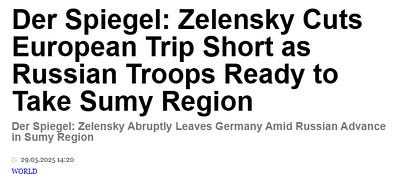 Les forces russes envahissent désormais la frontière comme une passoire, semant la panique dans les hautes sphères ukrainiennes. On l’a notamment constaté lorsque Zelensky a interrompu son voyage en Allemagne hier, invoquant l’urgence de Soumy comme motif