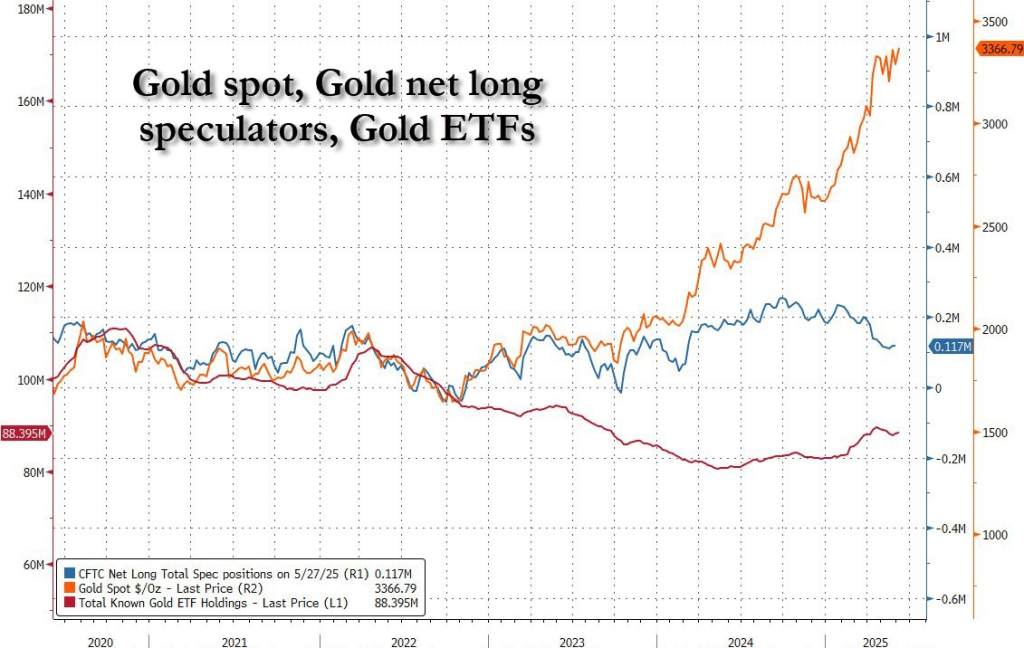 Malgré une envolée du prix de l’or dépassant les 3 360 dollars l’once, les positions spéculatives nettes sur contrats à terme et les avoirs totaux en ETF aurifères restent très faibles.