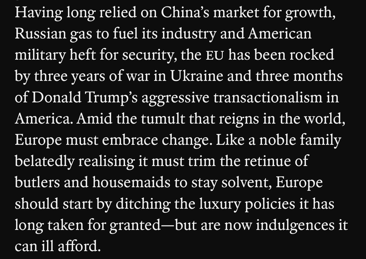 Voici résumée en quelques lignes toute la philosophie politique des élites, des ploutocrates, des kleptocrates mondialistes: il faut que l’Europe baisse son niveau de vie, travaille plus, gagne moins et abandonne ses prétentions à bien vivre.