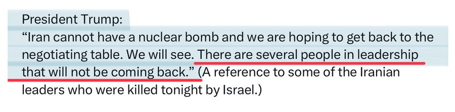 L’Iran a prévenu qu’il répliquerait en cas de frappes israéliennes. Un sixième round de négociations entre Américains et Iraniens avait été confirmé jeudi matin pour le 15 juin à Oman. « Nous espérons pouvoir revenir aux négociations », vient de déclarer Trump dans un échange téléphonique avec le journaliste Bret Baier, de Fox News, avant d’ajouter: « Plusieurs dirigeants iraniens, en revanche, ne reviendront pas. » Le président américain est informé en temps réel des assassinats de dirigeants iraniens. Cela signifie que ce sont des opérations conjointes des services israéliens (Mossad) et américains (CIA).