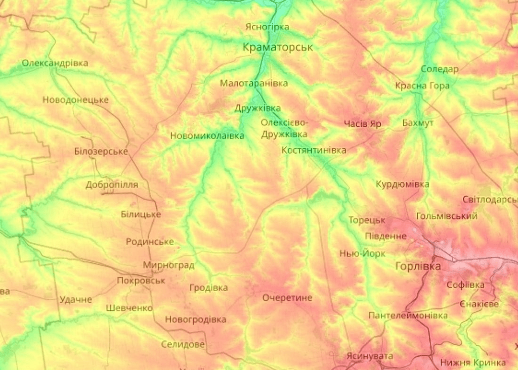 La première faille, ou vulnérabilité, est géographique et donc de loin la plus facile à comprendre. Le problème fondamental est que la ceinture urbaine de l’ouest de Donetsk (allant de Kostyantynivka à Sloviansk) repose sur le fond d’une vallée. Dans le secteur de Kostyantynivka en particulier, on trouve des points culminants locaux autour de Chasiv Yar, Toretsk et Ocheretyne, tous désormais fermement aux mains des Russes et constituant les bases de soutien pour l’avancée vers Kostyantynivka. À l’ouest de Kostyantynivka, un plateau en forme de coin sépare la ville de Pokrovsk, et c’est sur ce coin surélevé que les Russes progressent actuellement.