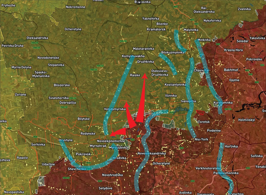 En bref, diverses faiblesses structurelles se conjuguent sur le même secteur du front. Les Russes progressent depuis des positions avantageuses en hauteur vers les failles structurelles des défenses ukrainiennes, précisément dans la zone du front qui sépare Pokrovsk et Kostyantynivka. Il en résulte un double encerclement, les Russes progressant par le milieu vers l’arrière, derrière ces villes. Le terrain et l’orientation des lignes ukrainiennes ont permis aux Russes de former un énorme coin de division qui coupera les lignes de communication avec les deux villes. Ce serait un problème majeur dans des circonstances idéales, mais compte tenu de l’incapacité de l’Ukraine à maintenir correctement ses positions, la situation est devenue critique.