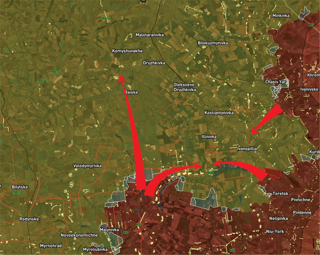 Les récentes avancées russes les ont désormais placés derrière les positions ukrainiennes gardant l’approche sud-ouest de Kostyantynivka. Lorsque les Russes atteignirent Yablunivka (vers le 4 juin), ils étaient solidement positionnés à l’arrière de la ceinture défensive au sud-ouest de Kostyantynivka, ouvrant la ligne ukrainienne à cet endroit pour pénétrer sur le flanc ouest de la ville et rejoindre l’avancée depuis Toretsk.