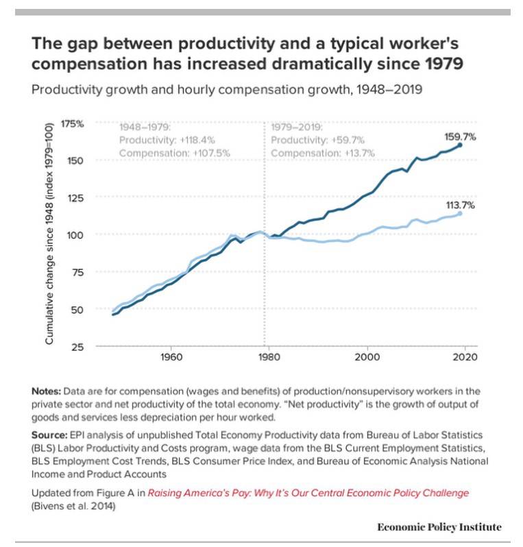 Le commentateur économique Noah Smith, cité par Brooks, omet également de mentionner Reagan et Volcker. Il attribue une « partie » de la « période de stagnation des salaires » à un « ralentissement de la productivité », déclarant : « Personne ne sait exactement pourquoi la productivité a ralenti pendant deux décennies, mais à mon avis, l’explication la plus probable est que le choc pétrolier de 1973 a inauguré une ère de pénurie énergétique. » Au départ, c’est compréhensible, même si l’on peut ergoter sur le moment.