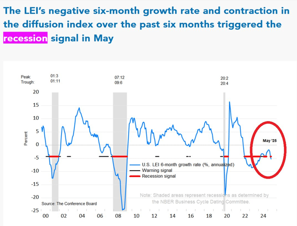 C’est un signal d’alarme pour tous ceux qui contestent encore le scénario d’un « atterrissage en douceur ». L’indice économique avancé (LEI) du Conference Board s’est désormais contracté de plus de 5 % en rythme annualisé au cours des six derniers mois, déclenchant officiellement un signal de récession à partir de mai 2025.