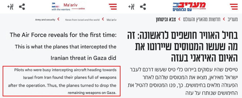 Au cours de la guerre de 12 jours menée par Israël contre l’Iran, les pilotes de l’armée de l’air israélienne revenant de missions d’interception transportant encore des munitions inutilisées ont été invités à les larguer sur Gaza au lieu d’atterrir entièrement chargées.