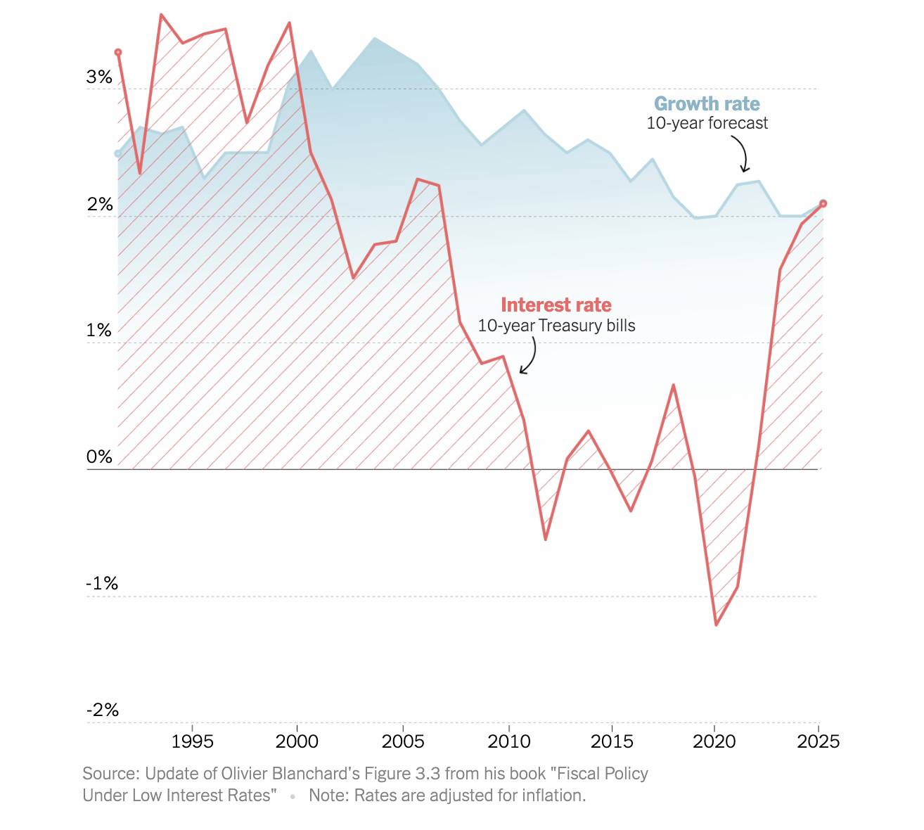 Selon le graphique de Blanchard, le problème de la durabilité était à son comble sous la présidence de Bill Clinton, une période récemment célébrée dans un autre essai du New York Times par deux secrétaires au Trésor de cette époque, Robert Rubin et Lawrence Summers . Leur mandat, affirment-ils, a « déclenché un cycle économique vertueux de croissance, de réduction du déficit, de baisse des taux d’intérêt et donc de hausse des investissements et de la croissance ».