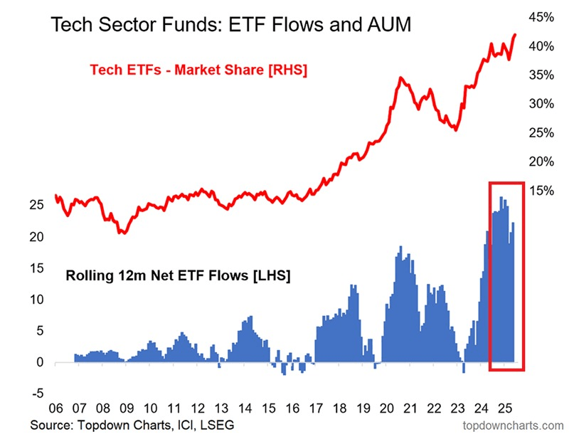La part des ETF technologiques dans le total des actifs sous gestion (AUM) du marché atteint désormais un niveau record de 42 %. La part de marché de la technologie a doublé au cours des 5 dernières années. Cela survient alors que les investisseurs ont investi environ 22 milliards de dollars dans ces fonds au cours des 12 derniers mois. Les entrées nettes sur 12 mois glissants dans les ETF technologiques ont constamment oscillé entre 19 et 26 milliards de dollars au cours des 18 derniers mois. Cela suggère que l’allocation des investisseurs dans les actions technologiques atteint des niveaux records. Le sentiment haussier est à son comble.