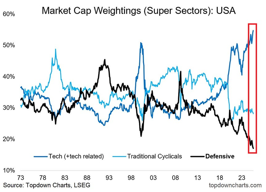 La concentration du marché n’a jamais été aussi extrême : Les actions technologiques et liées à la technologie représentent désormais un record de 55 % du marché boursier.