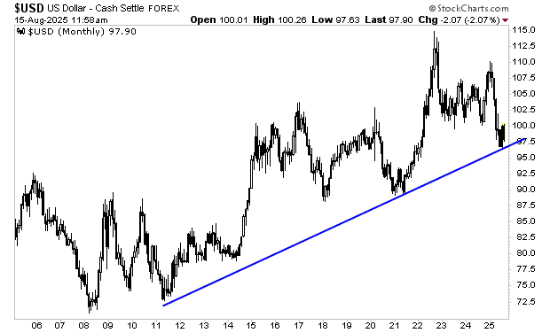 La décision de l’administration Trump de faire tourner l’économie à plein régime (dépenses massives, combinées à la pression exercée sur la Fed pour assouplir les conditions monétaires) a entraîné une perte de 10 % du dollar américain au premier semestre 2025 : son pire début d’année depuis 1973.