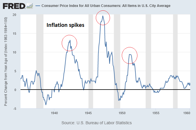 Au cours de la période YCC de 1942-1951, l’inflation a grimpé d’environ 75% au total. Posséder des obligations et détenir de l’argent était un désastre absolu.