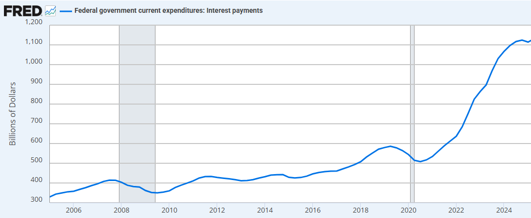 Si nous maintenons les taux aux niveaux actuels, les frais d’intérêt du gouvernement américain continueront de grimper en flèche. C’est le coût du service de la dette fédérale. Comme vous pouvez le voir sur le graphique ci-dessous, les paiements d’intérêts annuels ont explosé pour dépasser 1 trillion de dollars ces dernières années, la dette ayant grimpé en flèche et les taux ayant augmenté.