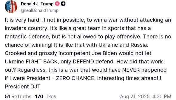 Le fait que ce tweet soit intervenu au moment même où Trump lançait son ultimatum de deux semaines et laissait entendre qu’il pourrait « changer de cap » laisse entendre qu’il pourrait fournir à l’Ukraine des armes offensives pour « attaquer » la Russie. Bien sûr, cela contredirait ses affirmations sur la « guerre de Biden », car un doublement des armes offensives la consoliderait certainement comme étant celle de Trump. Mais ce pourrait n’être qu’un exemple parmi tant d’autres de Trump triant avec soin les mérites et les reproches : tout ce qui sonne bien et fort est à son actif, et tout ce qui est faible et malavisé est à celui de Biden.
