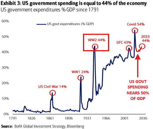 Le gouvernement américain dépense des montants qui représentent 44% du GDP.