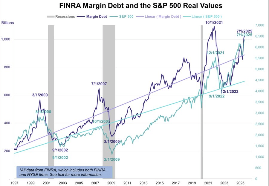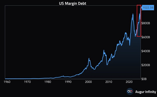 La dette sur marge vient d’atteindre un nouveau record historique : 1 022 milliards de dollars. Le marché est en feu, mais l’effet de levier qui le sous-tend l’est tout autant. C’est l’un des signaux les plus dangereux sur les marchés à l’heure actuelle.