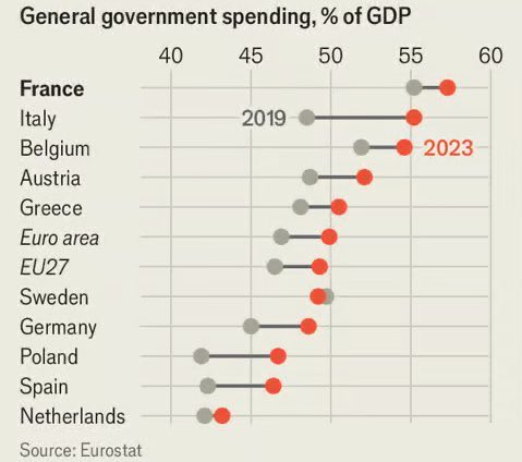 Comme on le sait la France détient ce record de pourcentage de dépenses du gouvernement dans la production nationale, -ou GDP- avec 57%.