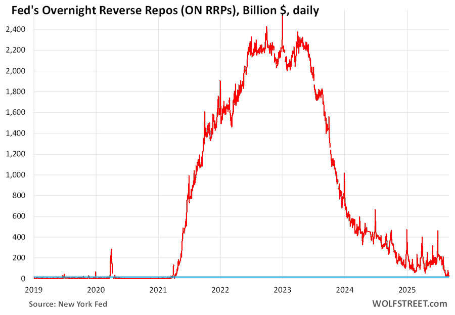 Avec des soldes de RRP de seulement 18 milliards de dollars, soit pratiquement des soldes nuls nuls, chaque dollar de nouvelle émission de bons du Trésor doit être financé directement sur le marché, par des banques, des fonds ou des acheteurs étrangers, plutôt que par le biais d’un réservoir de liquidités excédentaires.