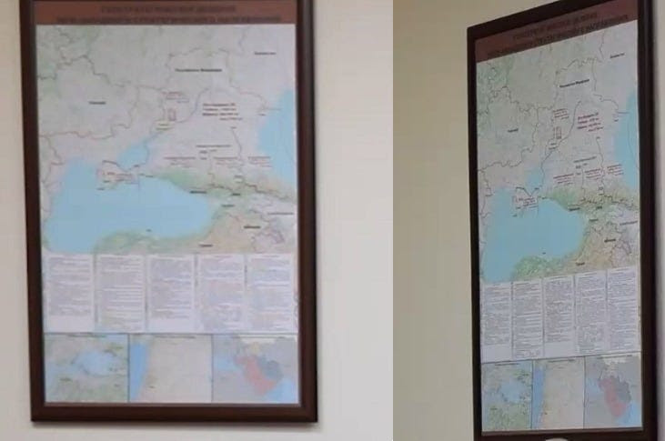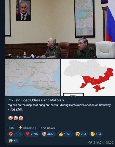 D’ailleurs, lors de la récente réunion d’état-major diffusée par Gerasimov, une carte a été repérée sur le mur qui montre le territoire russe comme englobant toutes les régions de Kherson, Nikolaïev et Odessa